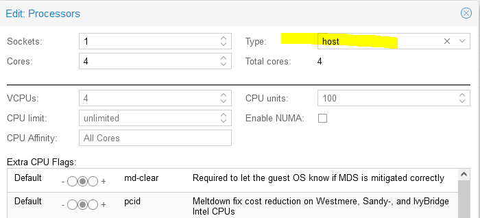В настройках VM нужно выбрать тип процессора "host"